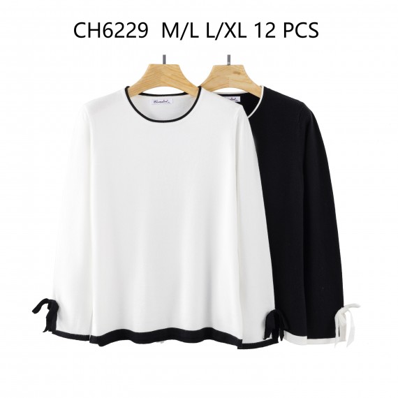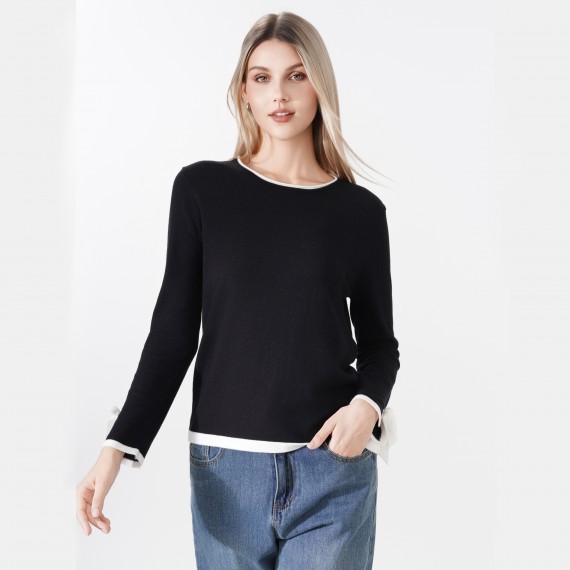 12gg crew neck sweater with contrasting trim and bow on the sleeves. It's a casual style ideal for everyday wear.