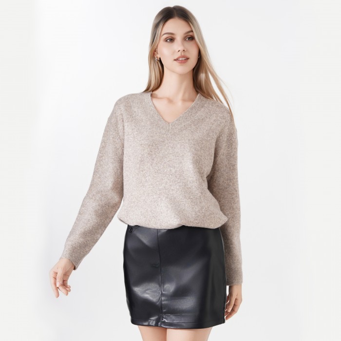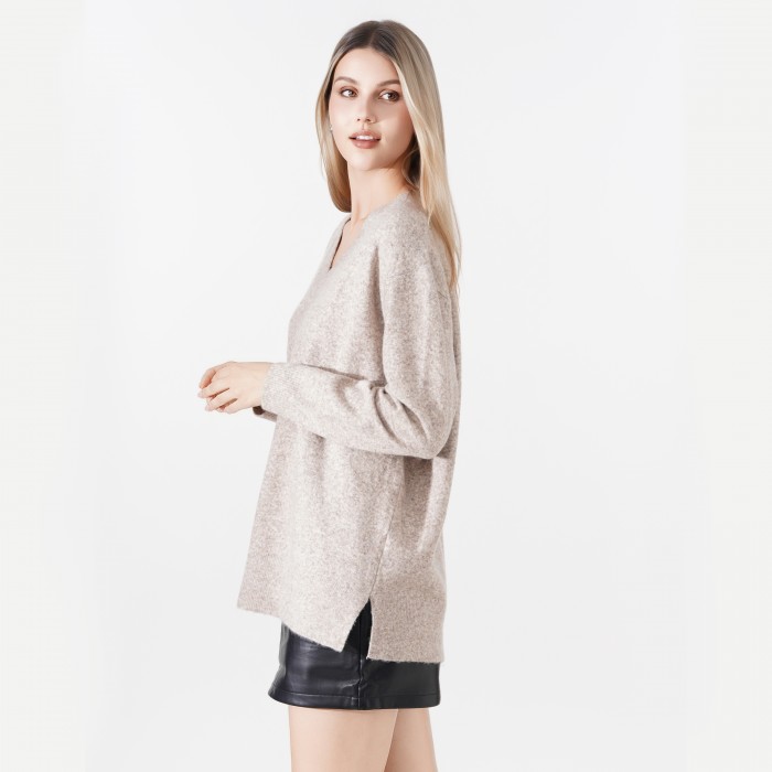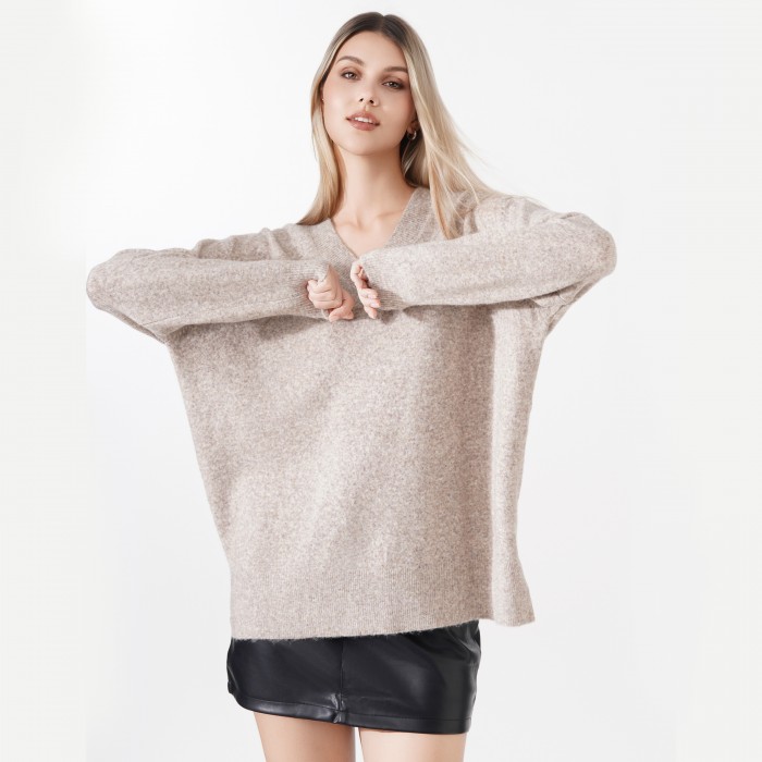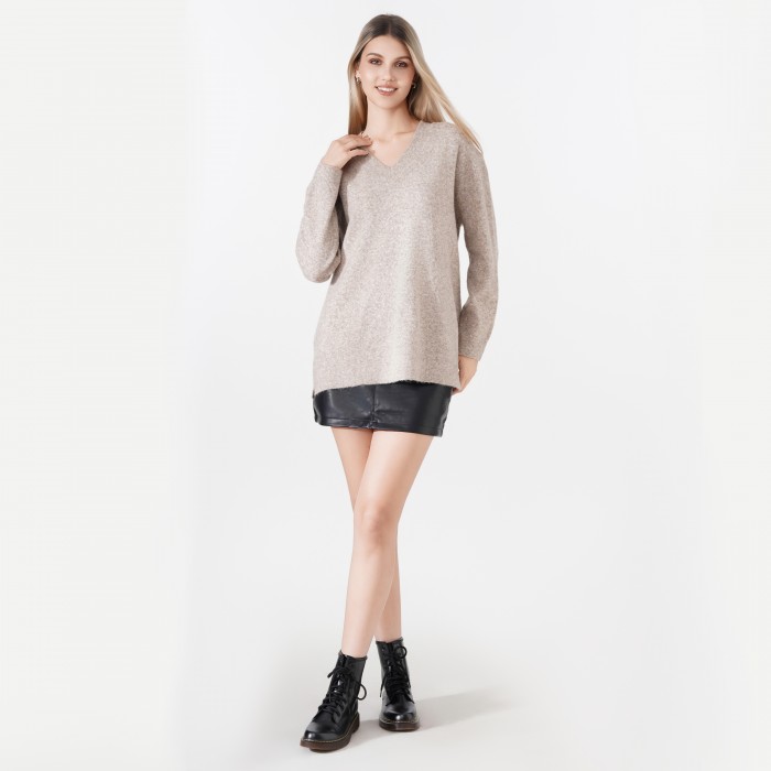 Long, plain turtleneck sweater. Made with a loose fit. It can be easily paired with jeans or leggings.