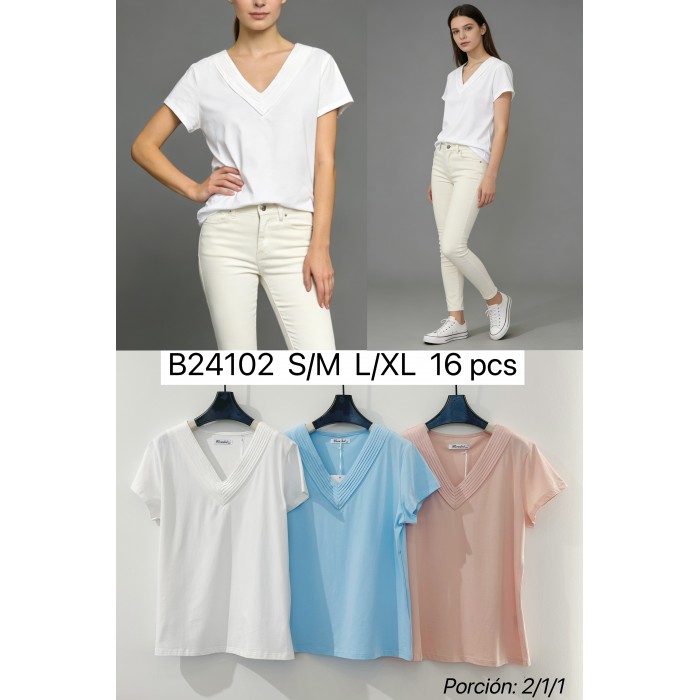Camiseta de algodón de cuello pico de tacto suave. Es una pieza mona de uso diario para las combinaciones de verano.